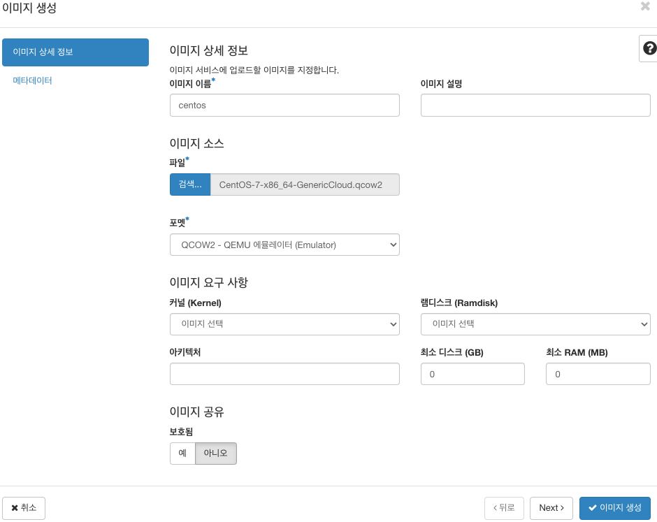 - 싱글 노드이므로 서버 스펙 여유롭게 설정, OS는 Centos7 선택