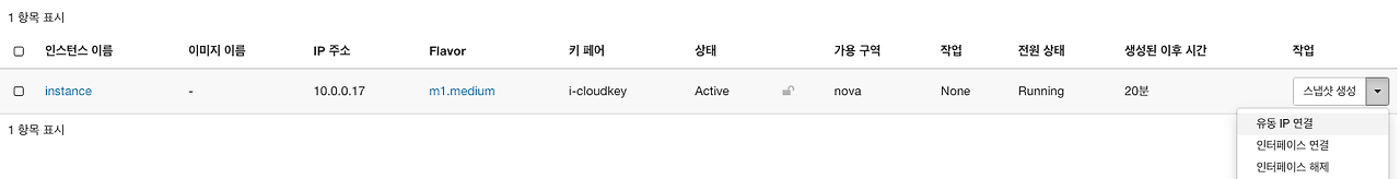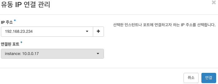 - 유동 IP 연결 클릭(이 때 IP 할당이 불가능하면 프로젝트에 floating IP 할당)