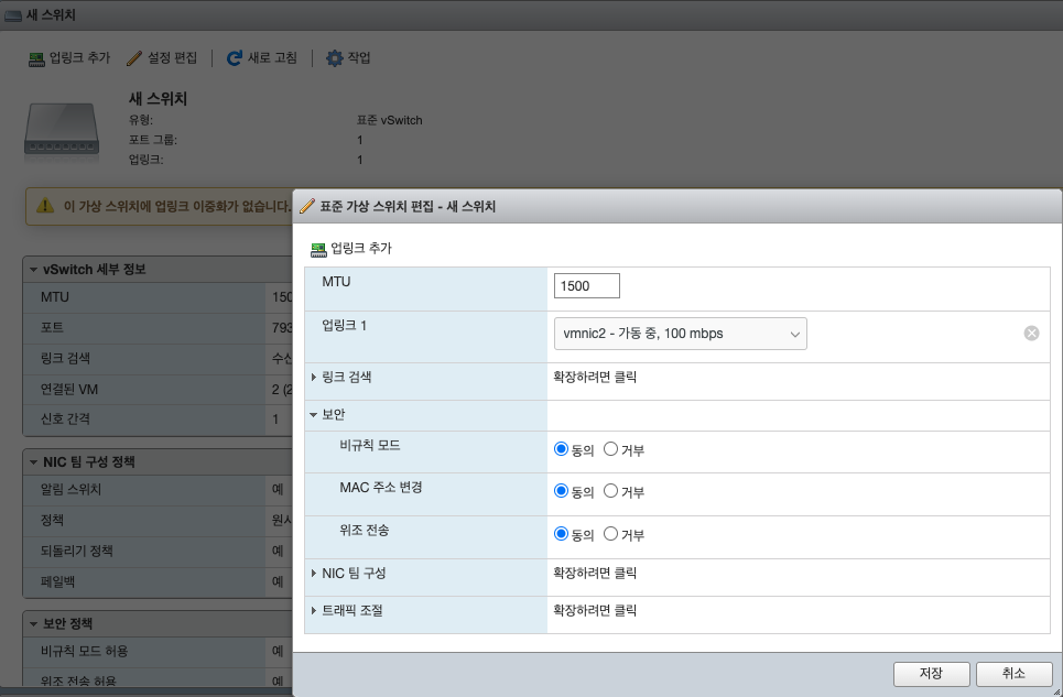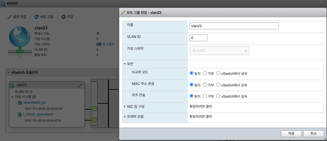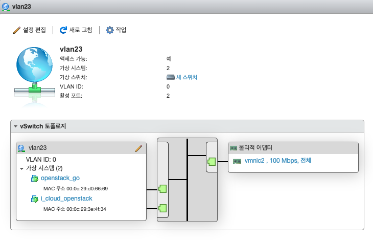 - 가상 스위치에서 물리 어댑터 연결 확인 → 해당 스위치에서 오픈스택 서버 생성