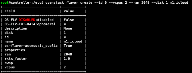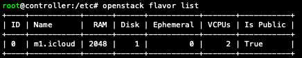 openstack flavor create --id 0 --vcpus 2 --ram 2048 --disk 1 m1.icloud