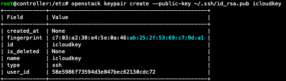 openstack keypair create --public-key ~/.ssh/id_rsa.pub icloudkey